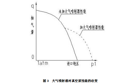 需要说明的是,大气喷射器的作用不仅是提高了被抽系统的真空度,当泵在非常低的压力下工作时,泵腔内会产生汽蚀现象,会使泵的振动和噪音增加,利用大气喷射器不仅可以使真空泵不需要在很抵的压力下工作,而且对提高真空泵运行的平稳性也是非常重要的。
