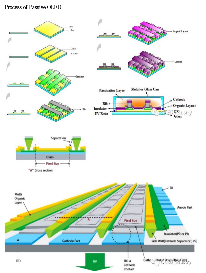 为了实现无源矩阵OLED的高分辨率和彩色化,更好地解决阴极模板分辨率低和器件成品率低等问题,人们在研究中引入了阴极隔离柱结构。即在器件制备中不使用金属模板,而是在蒸镀有机薄膜和金属阴极之前,在基板上制作绝缘的间壁,最终实现将器件的不同像素隔开,实现像素阵列。
