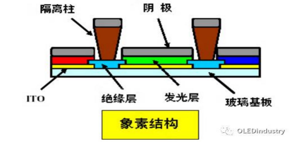 隔离柱的形状是隔离效果关键,绝缘缓冲层来解决同一像素间的短路问题,同时使用倒立梯形的隔离柱来解决相邻像素间的短路问题。