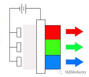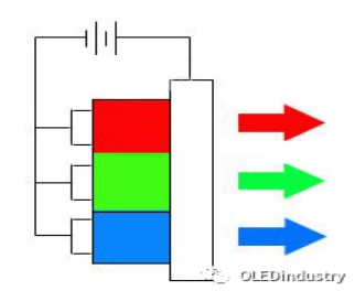 这是最常使用的技术,就是将三种发光层排列在一起,加入不同的偏压产生全彩的效果,此技术重点在于发光材料光色纯度与效率的掌握。以小分子有机发光二极管技术而言,所面临的重大问题就是红色材料的纯度、效率与寿命,而大分子有机发光二极管方面,则是在于红、绿、蓝三原色定位等问题
