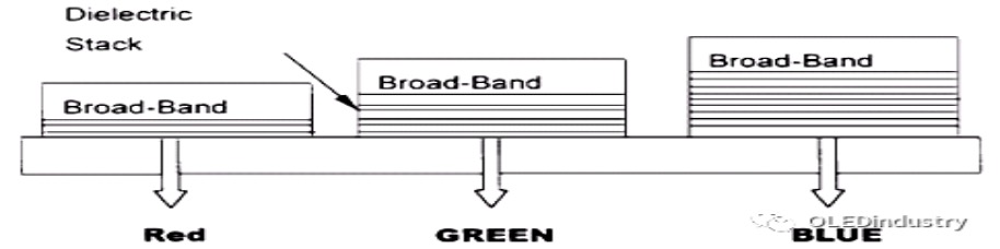 此法是将三种发光层叠在一起,使红、绿、蓝混色产生白光,或是互补色产生白光。此全彩化技术最大的优点是可以直接应用液晶显示器现有的彩色滤光片技术,但是元件发光时必须多经过一层彩色滤光片,导致亮度衰减,因此在透光率与成本上必须再深入研究。